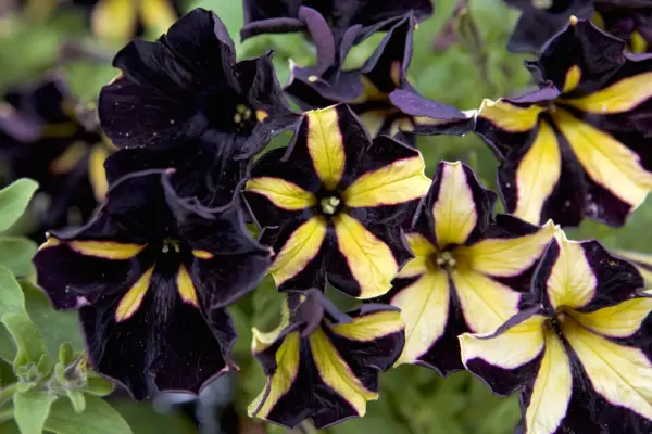 Petunia 'Přízrak' is an especially eye-catching variety, with velvety black flowers that develop yellow demarcations on each petal as they mature, giving them a starry appearance. This cultivar has an upright, mounding growth habit.